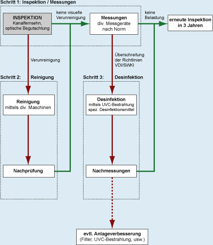 Wurde bei den Messungen eine mikrobiologische Verunreinigung festgestellt, so wird das Luftleitungssystem mittels speziellen Desinfektionsmitteln oder UVC-Bestrahlung desinfiziert. Danach werden nochmals Nachmessungen zur Kontrolle durchgeführt. Weil jedoch das Desinfektionsmittel nur eine beschränkte Haft- und Wirkungsdauer (ca. 6 Monate) hat, ist diese Massnahme über einen langen Zeitraum betrachtet zu wenig effektiv.